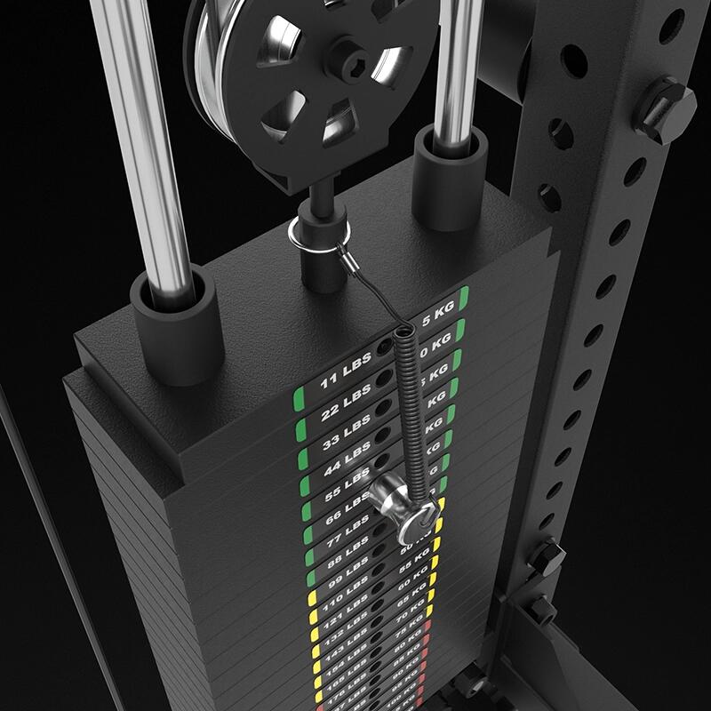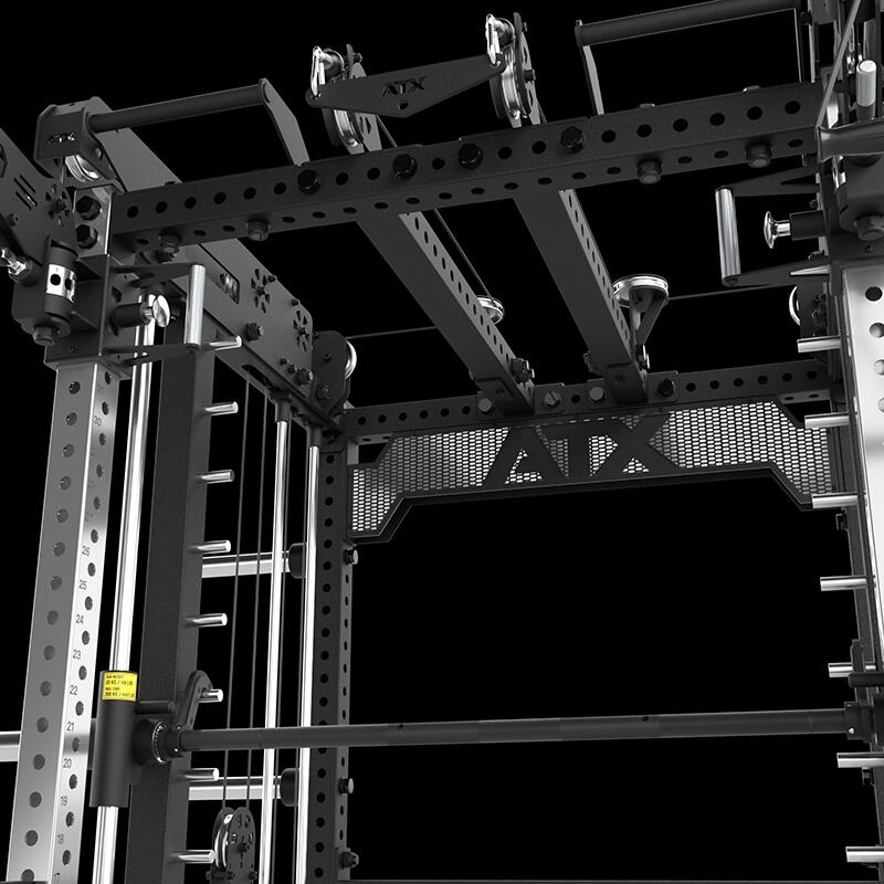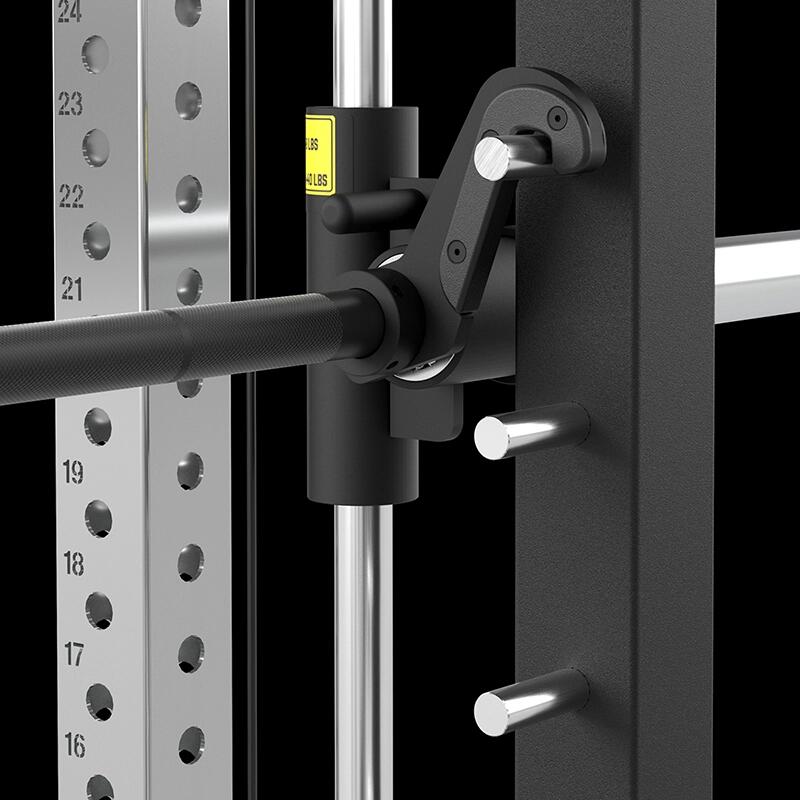 Toate exercițiile relevante cu haltera pot fi efectuate pe rack-ul pentru greutăți libere sau pe presa liniară multi-press. J-hooks și spottere sunt incluse. Un dispozitiv de tracțiuni este, de asemenea, integrat.