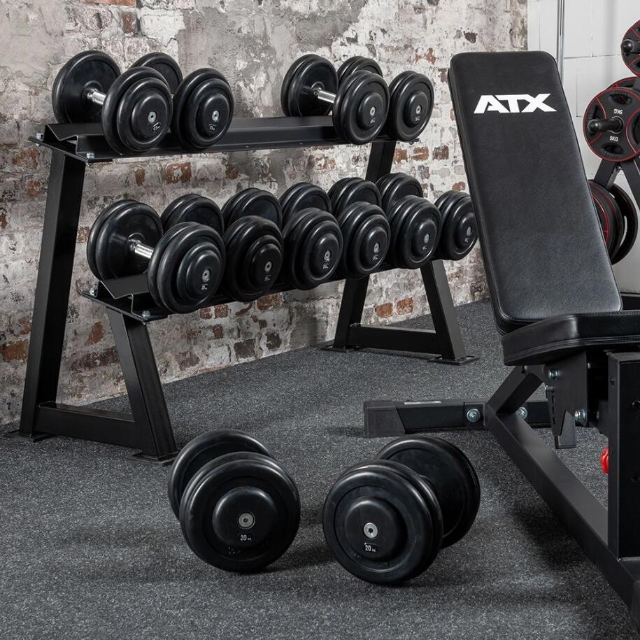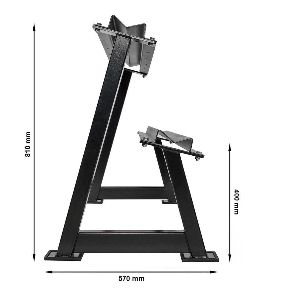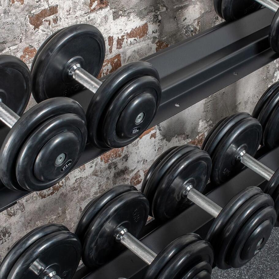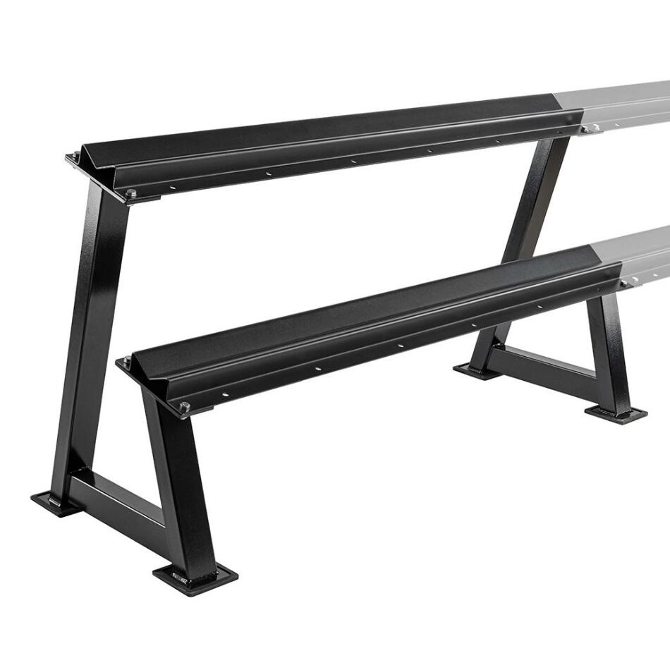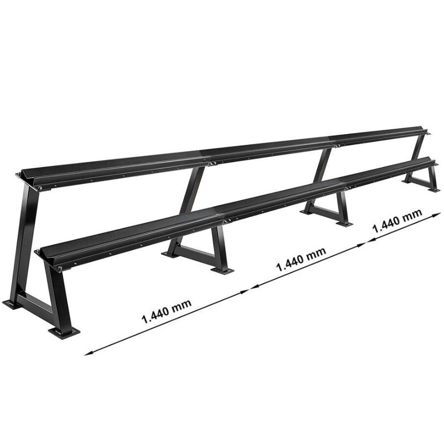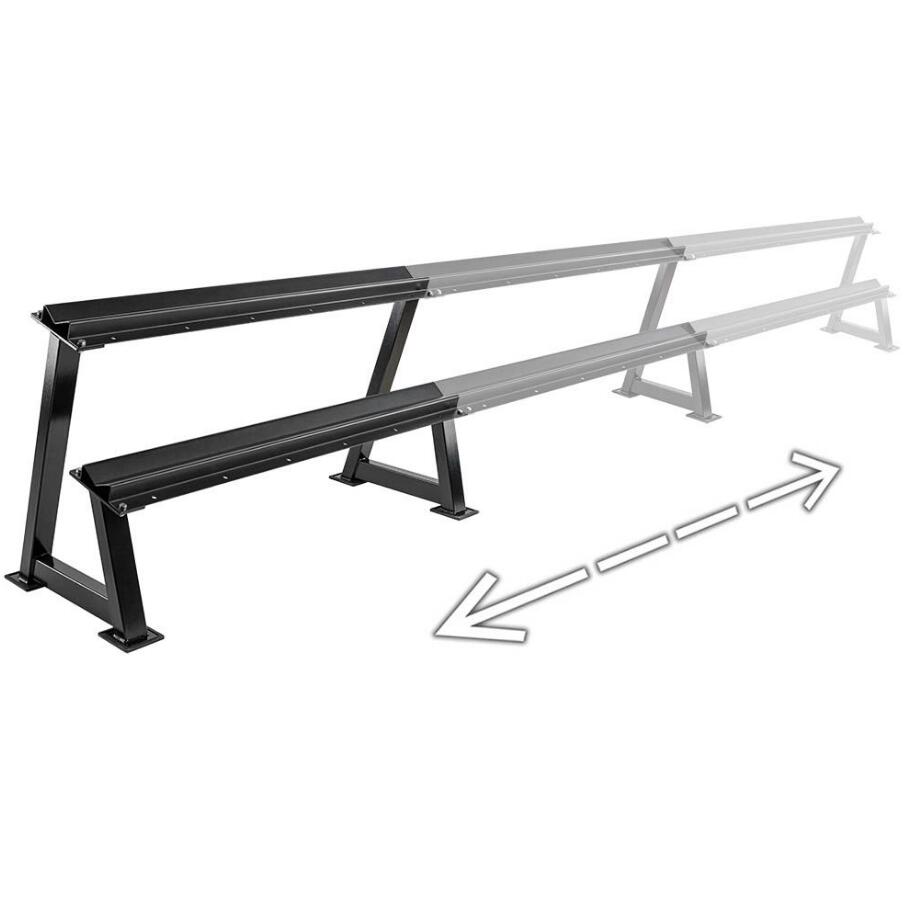 Acest suport pentru gantere poate fi extins în lungime după dorință. Raftul se caracterizează printr-o calitate extrem de ridicată a manoperei și o stabilitate. Ganterele își găsesc locul în tăvile de depozitare cu două niveluri fără să alunece.