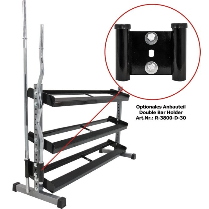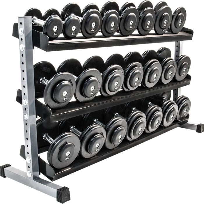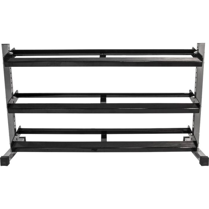 Suportul pentru gantere cu 3 niveluri și lățime de 120 cm oferă o soluție stabilă și profesională pentru depozitarea ganterelor în sala de fitness sau în home gym. Construcția modulară permite montarea individuală a rafturilor la înălțimea dorită, astfel încât suportul să poată fi adaptat în funcție de tipul și dimensiunea ganterelor utilizate.
