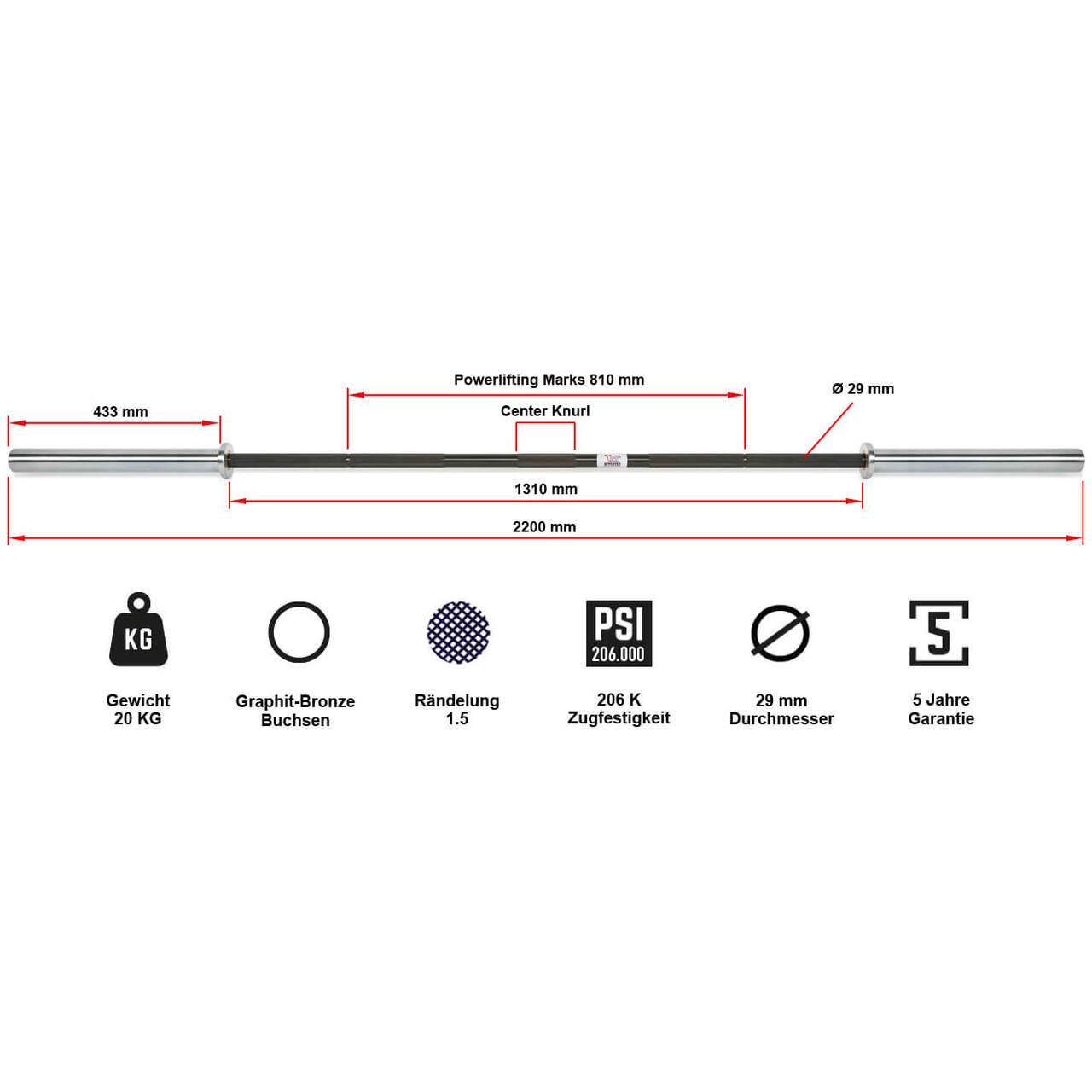 Are capacitate de încărcare de 700 kg și rezistență foarte bună în timp. Diametrul mânerului de 29 mm și zimțarea de 1.5 fac ca această bară să se potrivească perfect în mâinile atletului. Placată cu crom rezistent la abraziune, mâner îmbrăcat în oxid negru, care o face să pară moale în mâini.